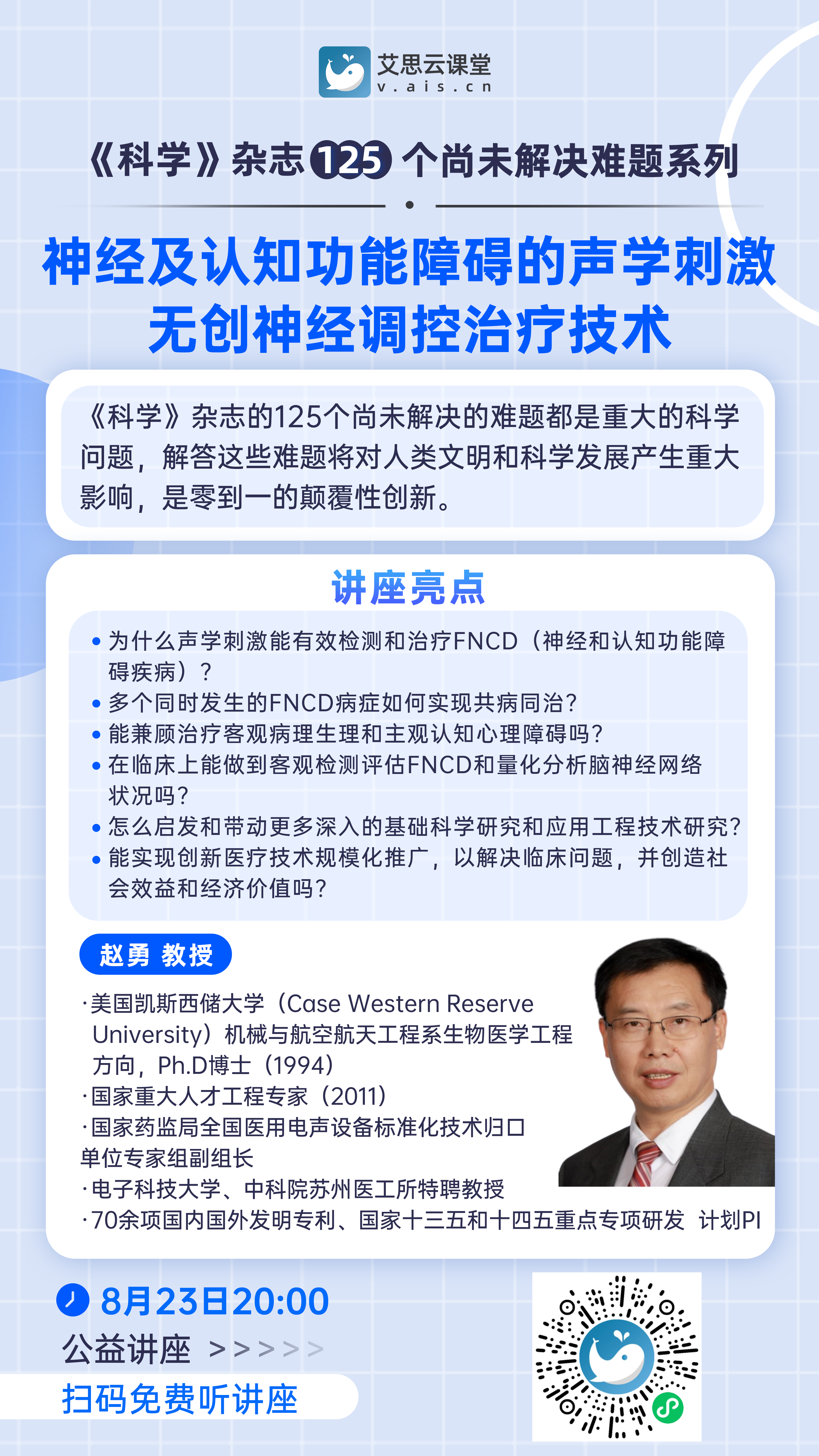 如果大家對聲學(xué)刺激無創(chuàng)神經(jīng)調(diào)控技術(shù)在神經(jīng)和認(rèn)知功能障礙疾病治療中的應(yīng)用感興趣,不容錯(cuò)過趙勇博士的公益講座。講座將于8月23日晚上20:00進(jìn)行(掃二維碼報(bào)名參會(huì)學(xué)習(xí))。無論是科學(xué)愛好者還是醫(yī)療領(lǐng)域從業(yè)者,這次講座都將帶給大家新的啟發(fā)和思考。