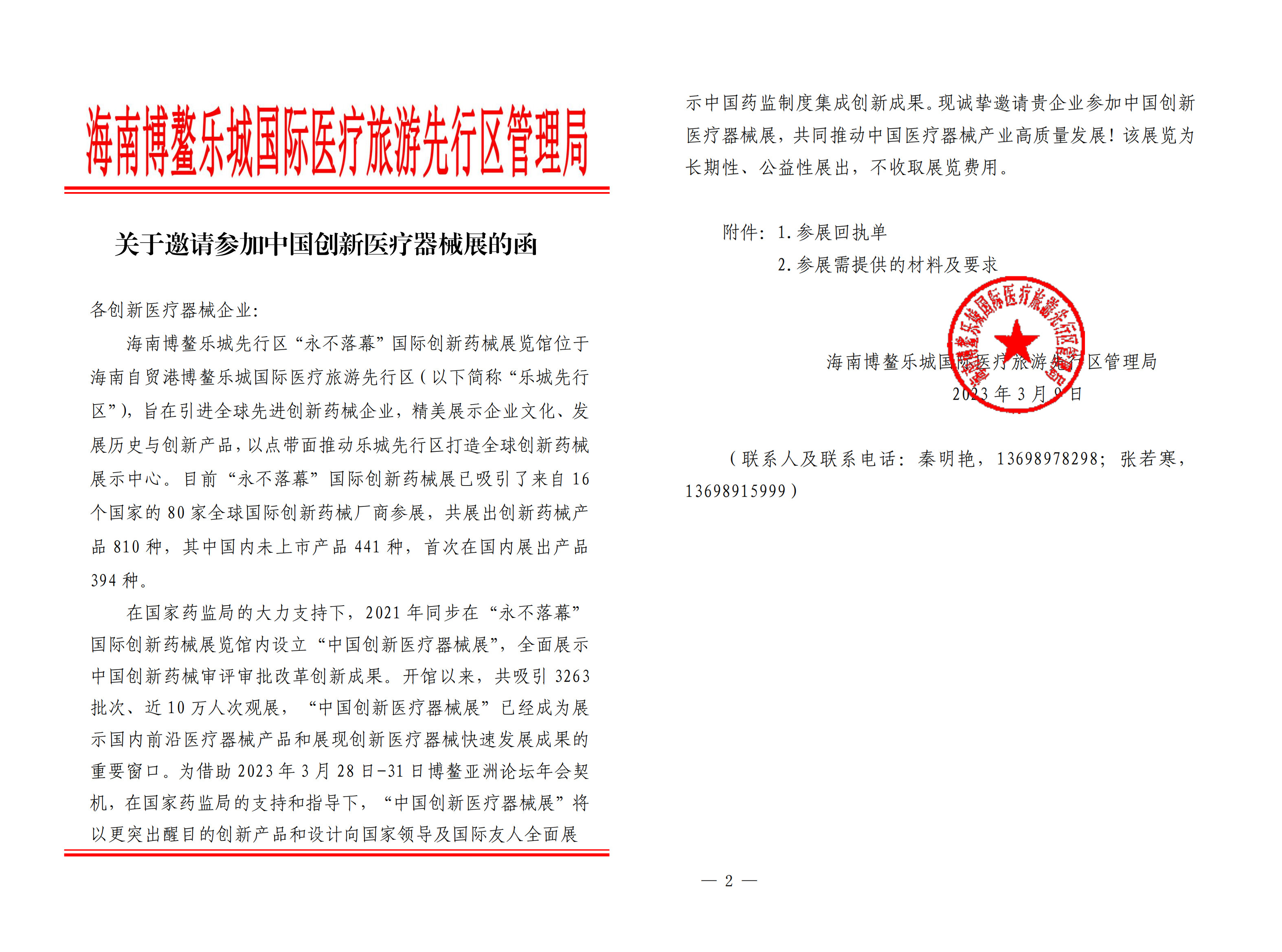 此次展會在海南博鰲樂城先行區(qū)“永不落幕”國際創(chuàng)新藥械展覽館位于 海南自貿(mào)港博鰲樂城國際醫(yī)療旅游先行區(qū)(以下簡稱“樂城先行 區(qū)”)召開,是長期性、公益性展出,不收取展覽費用,并借助 2023 年 3 月 28 日-31 日博鰲亞洲論壇年會契機(jī),在國家藥監(jiān)局的支持和指導(dǎo)下,“中國創(chuàng)新醫(yī)療器械展”將以更突出醒目的創(chuàng)新產(chǎn)品和設(shè)計向國家領(lǐng)導(dǎo)及國際友人全面展示中國藥監(jiān)制度集成創(chuàng)新成果,所以我們非常感謝主辦方的熱情邀請和支持。